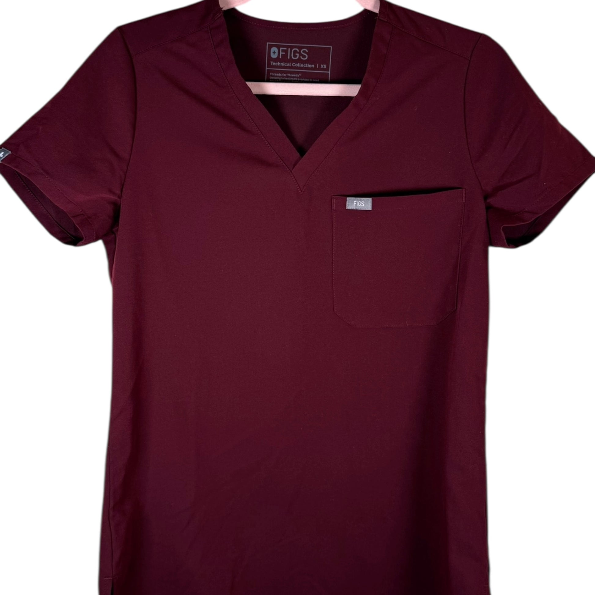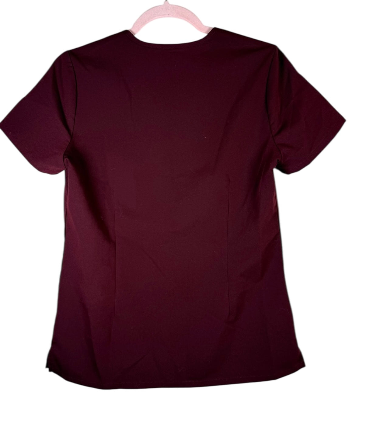 A burgundy FIGS scrub set with a clean V-neck top and matching pants that drape just right, giving you that structured-but-comfortable fit nurses love for long, nonstop shifts.